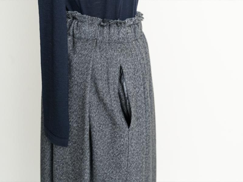 たて糸にコットン糸、よこ糸にはウールヘンプを撚った糸を使用し、厚みがありながら軽く、温かみのある質感のANTIPASTのスカートです。ヘンプは熱伝導が緩やかで、寒い時期は外気の影響を受けにくい素材のため、暖かく着用していただけます。