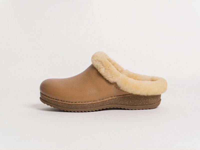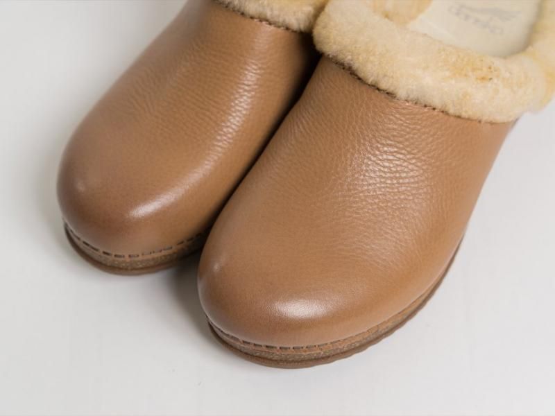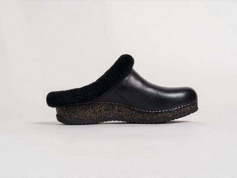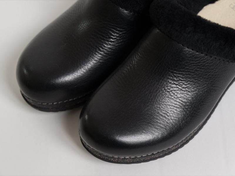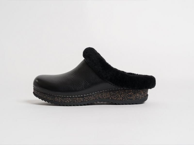 ステープル構造の軽量ミュールに高品質のレザーを組み合わせ、ミッドソールには耐久性のあるコルクが使われています。