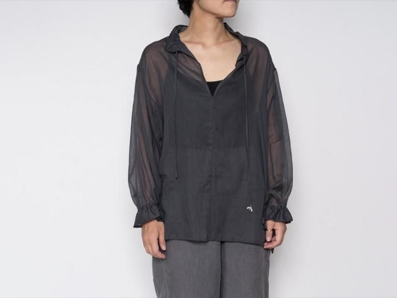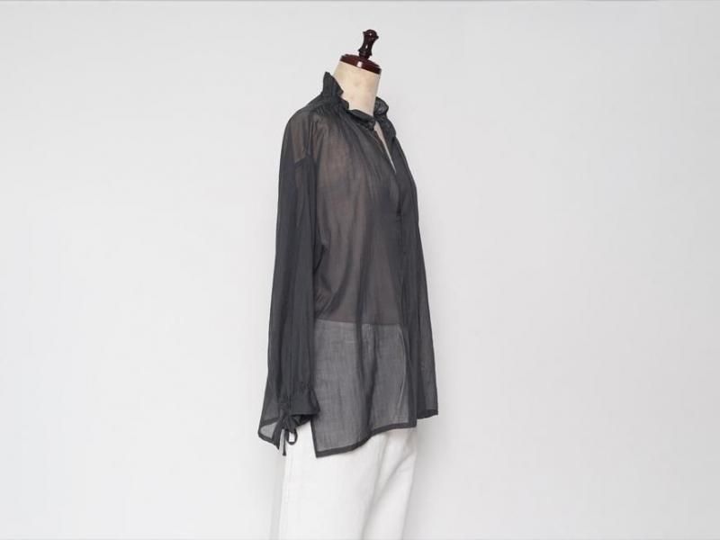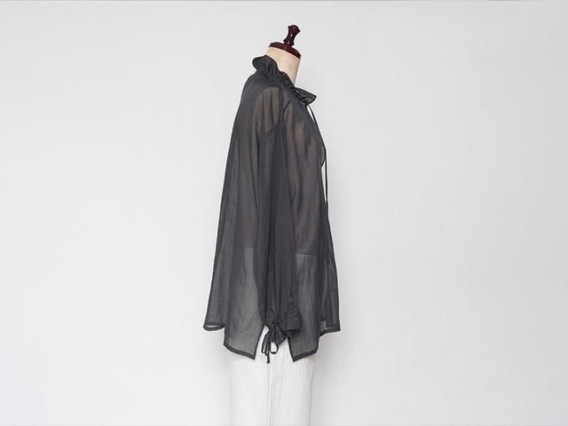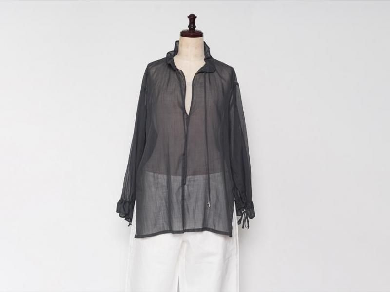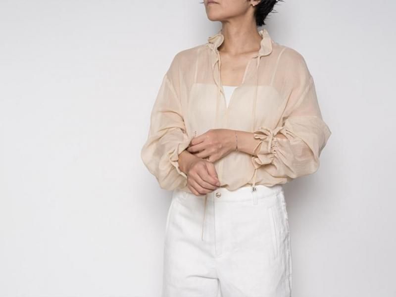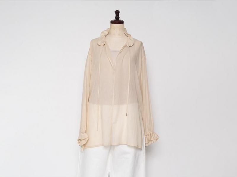 9月とはいえ暑さの残る今からでももすぐに着られるような、肌触りの良いローン素材のコットンブラウス。袖口や襟元は細いコードでお好きなボリュームにギャザーをよせて着られます。襟元はリラックスした雰囲気で開けたり、また、結ぶとボウタイのような雰囲気で少しクラシカルです。