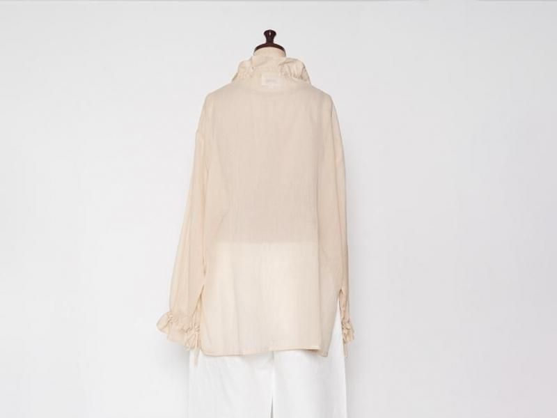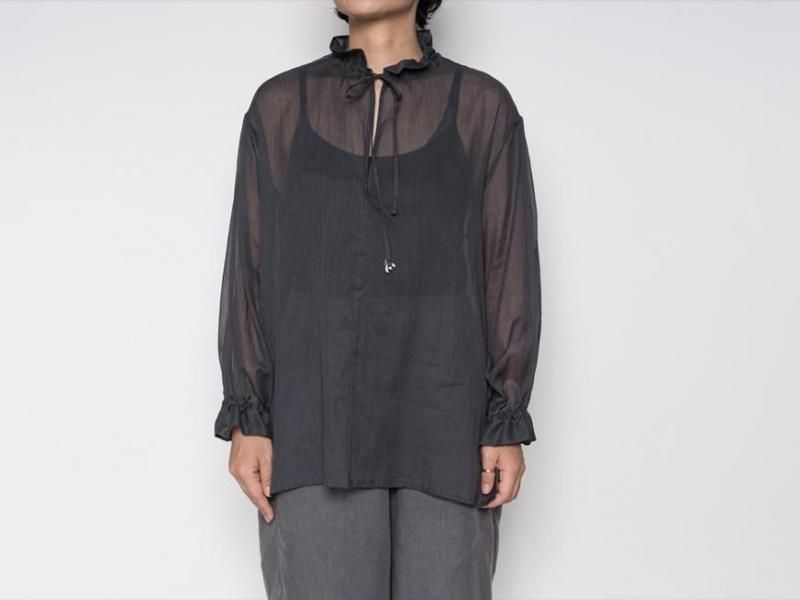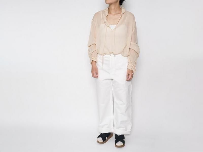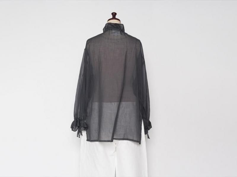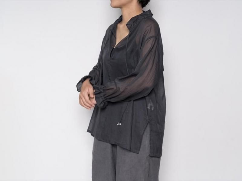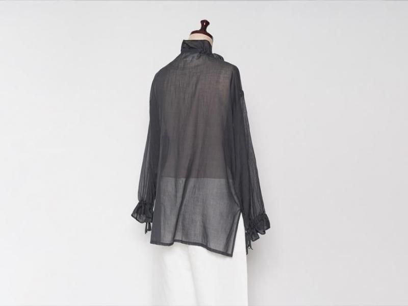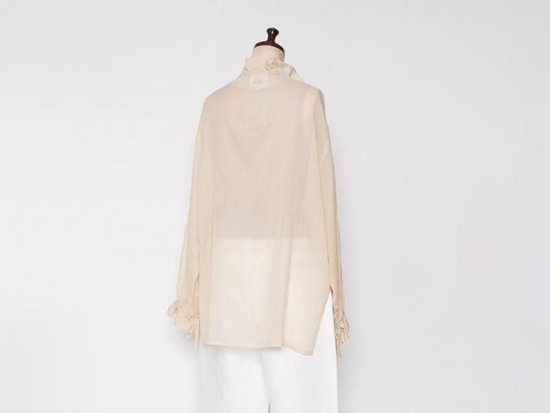 9月とはいえ暑さの残る今からでももすぐに着られるような、肌触りの良いローン素材のコットンブラウス。袖口や襟元は細いコードでお好きなボリュームにギャザーをよせて着られます。襟元はリラックスした雰囲気で開けたり、また、結ぶとボウタイのような雰囲気で少しクラシカルです。