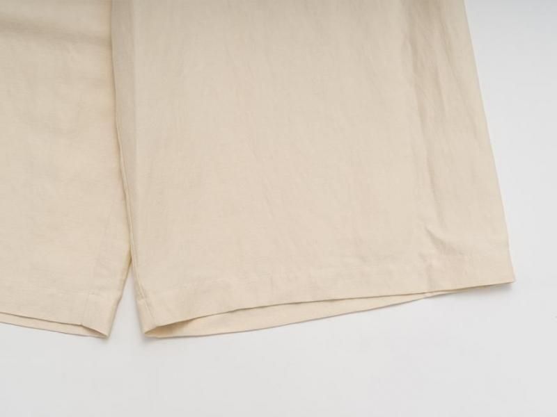 リネン素材の生地は張り感がしっかりしているものが多いですが、こちらは、縦糸に中太番手のリネン、ヨコ糸に中太番手のシルク糸を用い、膨らみがありながらも軽い感触が特徴の柔らかな生地です。また、肌に触れる面には、加工を施し、素肌にも気持ち良いようにピーチタッチに仕上げられたそうです。