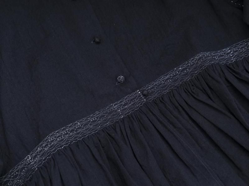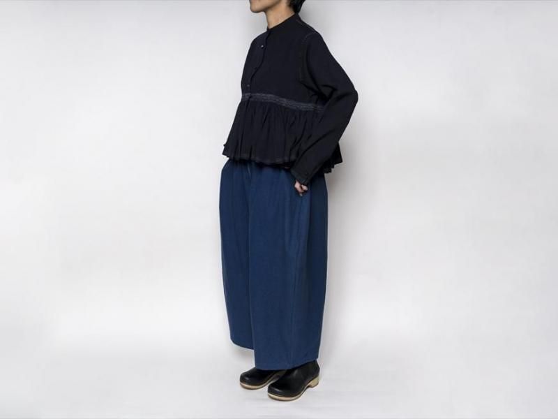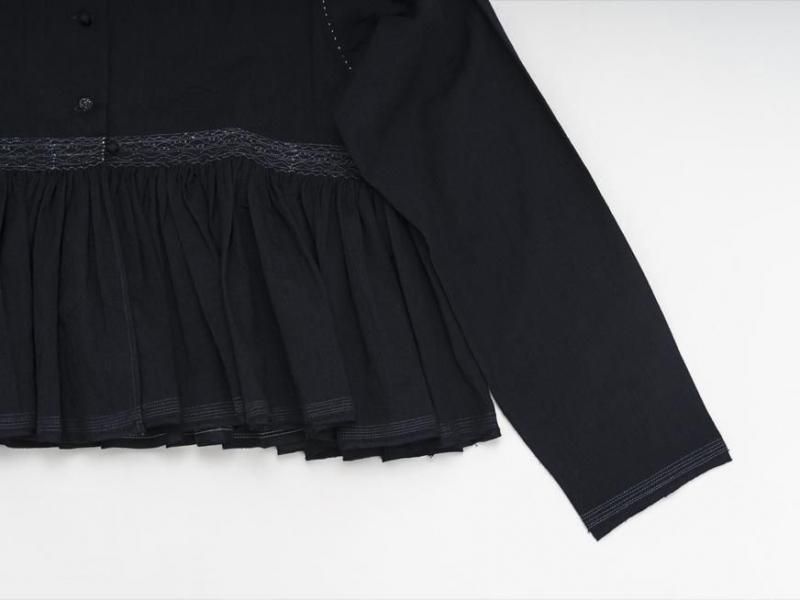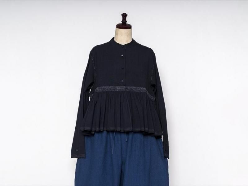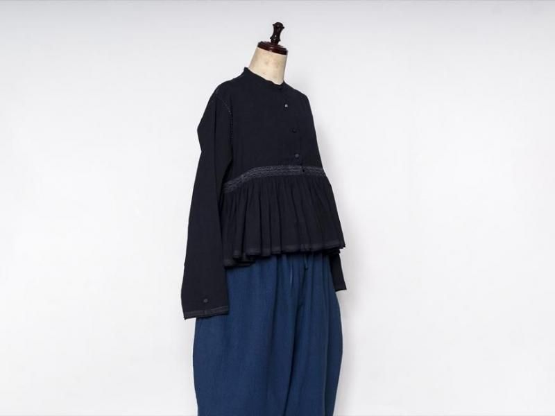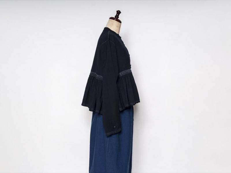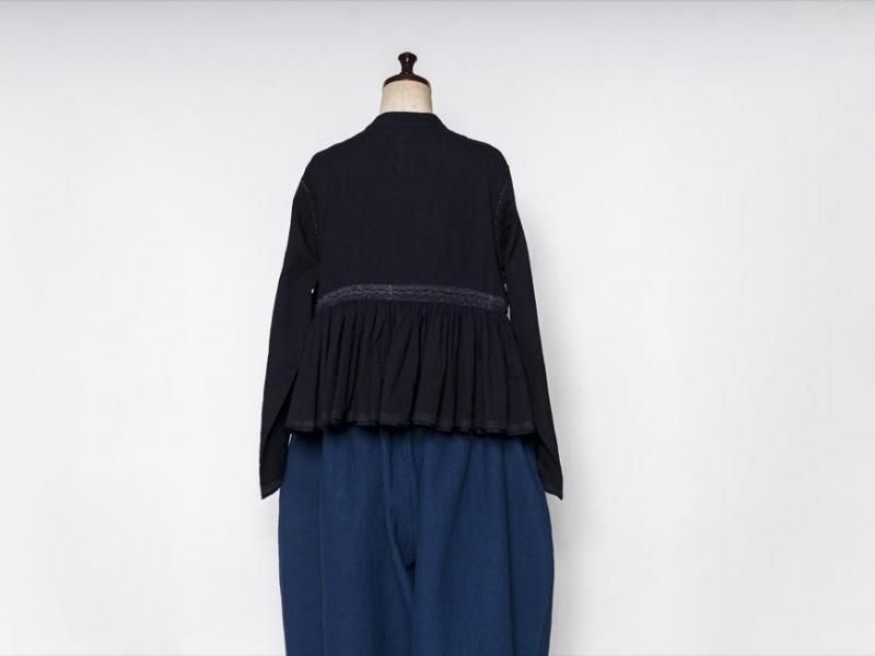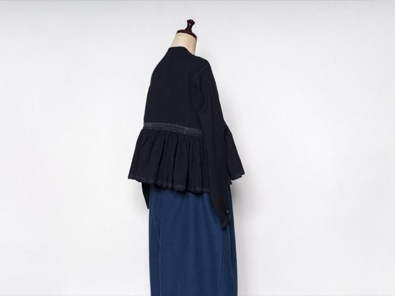 高い位置の切り替えから広がるギャザーのシルエットは、ボトムスを選ばず様々なコーディネートが楽しめます。また、ワンピースなどのドレスの上に羽織るのにもぴったりです。肩のステッチやくるみボタンの刺繍にmakuらしい遊び心が感じられます。