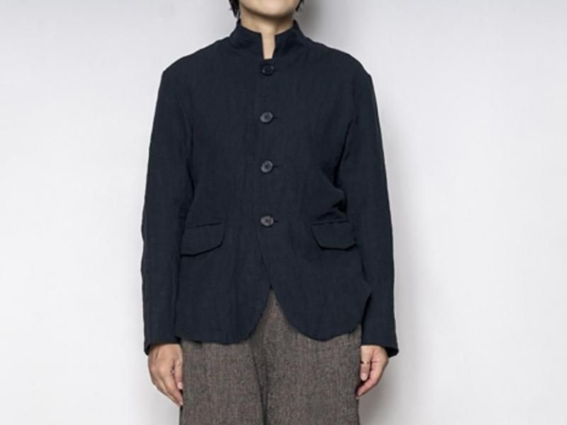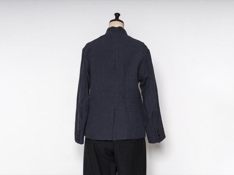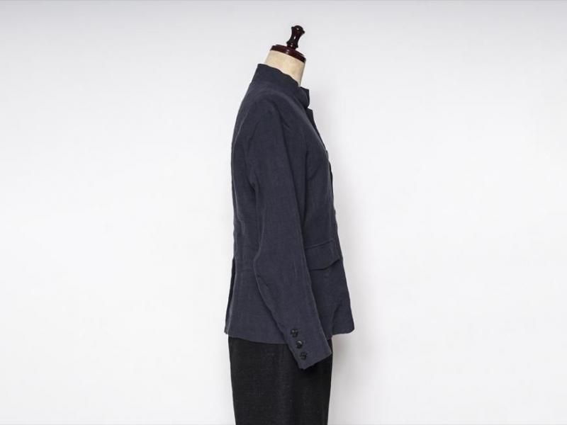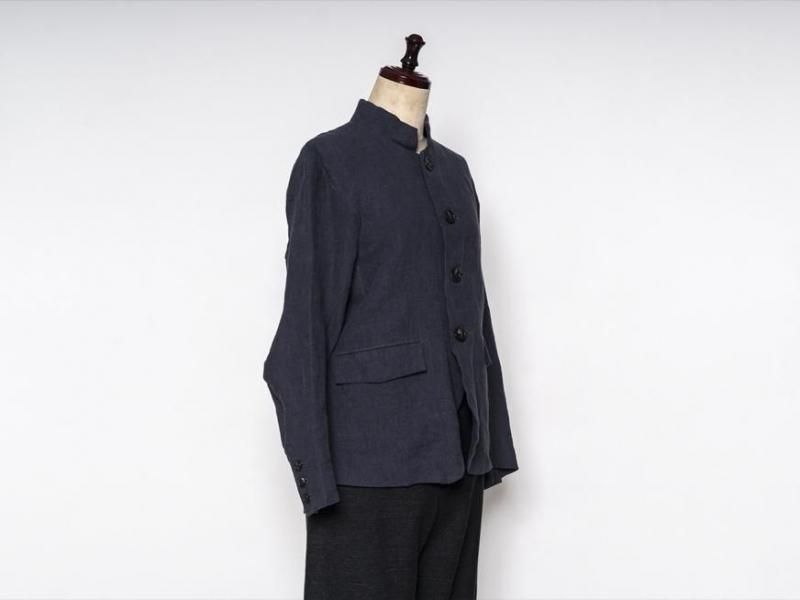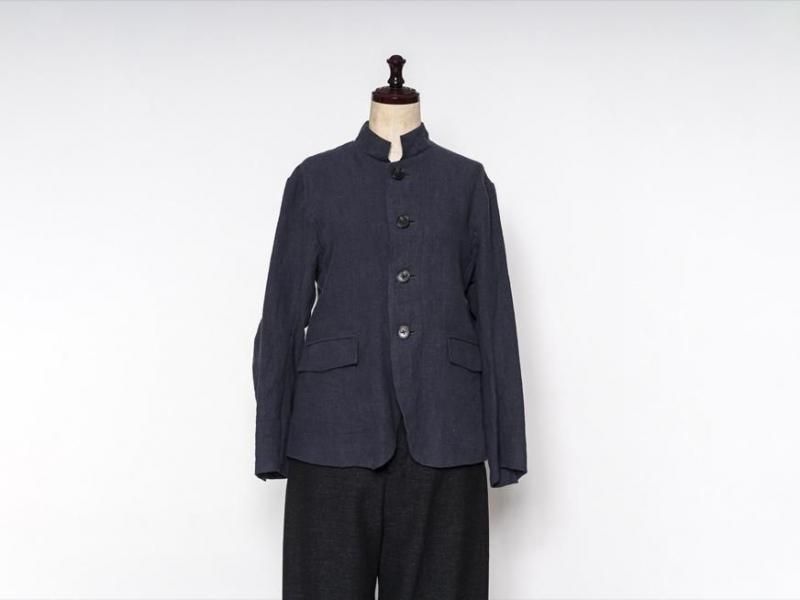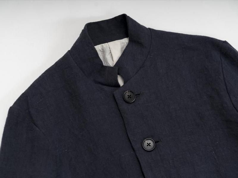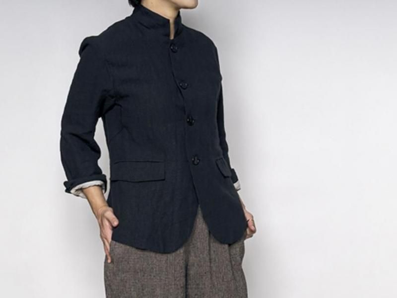 少しレトロな雰囲気のあるマニッシュなジャケット。洗いをかけたリネンの質感が肌触りの良さを感じさせます。襟元のデザインは、ボタンを外し折り返してテーラードカラー、上まで留めてキリッとスタンドカラーの2パターンを、その日の気分に合わせて