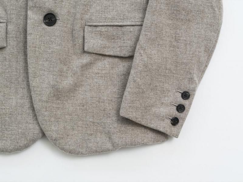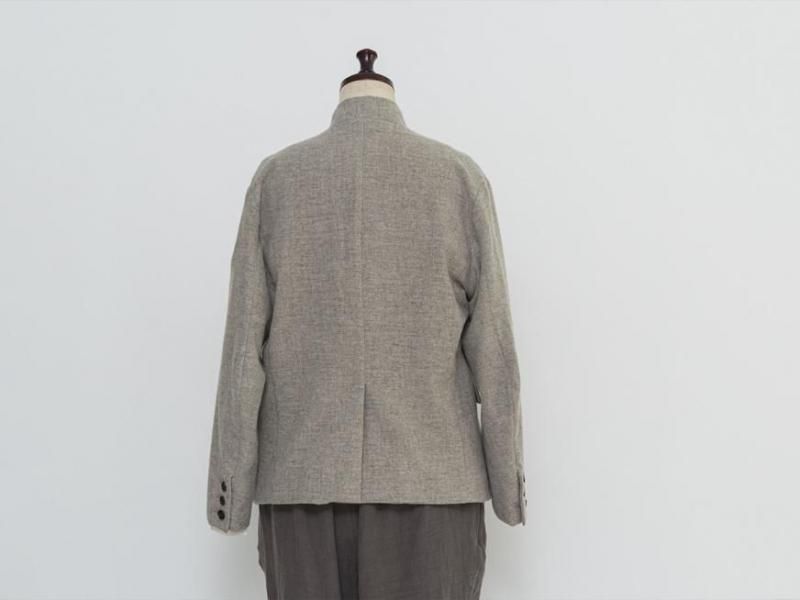 素材のふんわりとした質感の着心地の良さが見た目からも感じられる、シンプルなデザインのジャケットのご紹介です。襟元は、ボタンを外し折り返してテーラードカラー、上まで留めてキリッとスタンドカラーの2パターンで、雰囲気を変えて楽しむことができます。その日の気分に合わせて楽しめます。コットン×シルクの裏地は滑らかで肌触り良く、袖口を折り返した時にチラリと白いラインが見えるのも良いアクセントになります。